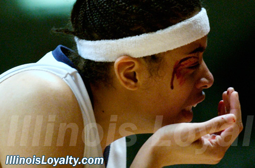 Illinois' Danyel Crutcher seeks medical attention after a head to head collision with Minnesota's Brittany McCoy. Both players were diving after a loose ball, and both players would return.