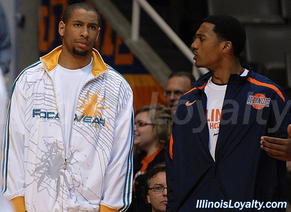 Dominique Keller (left) chats with Alex Legion. Keller, a junior college forward, committed to the Illini after the game.