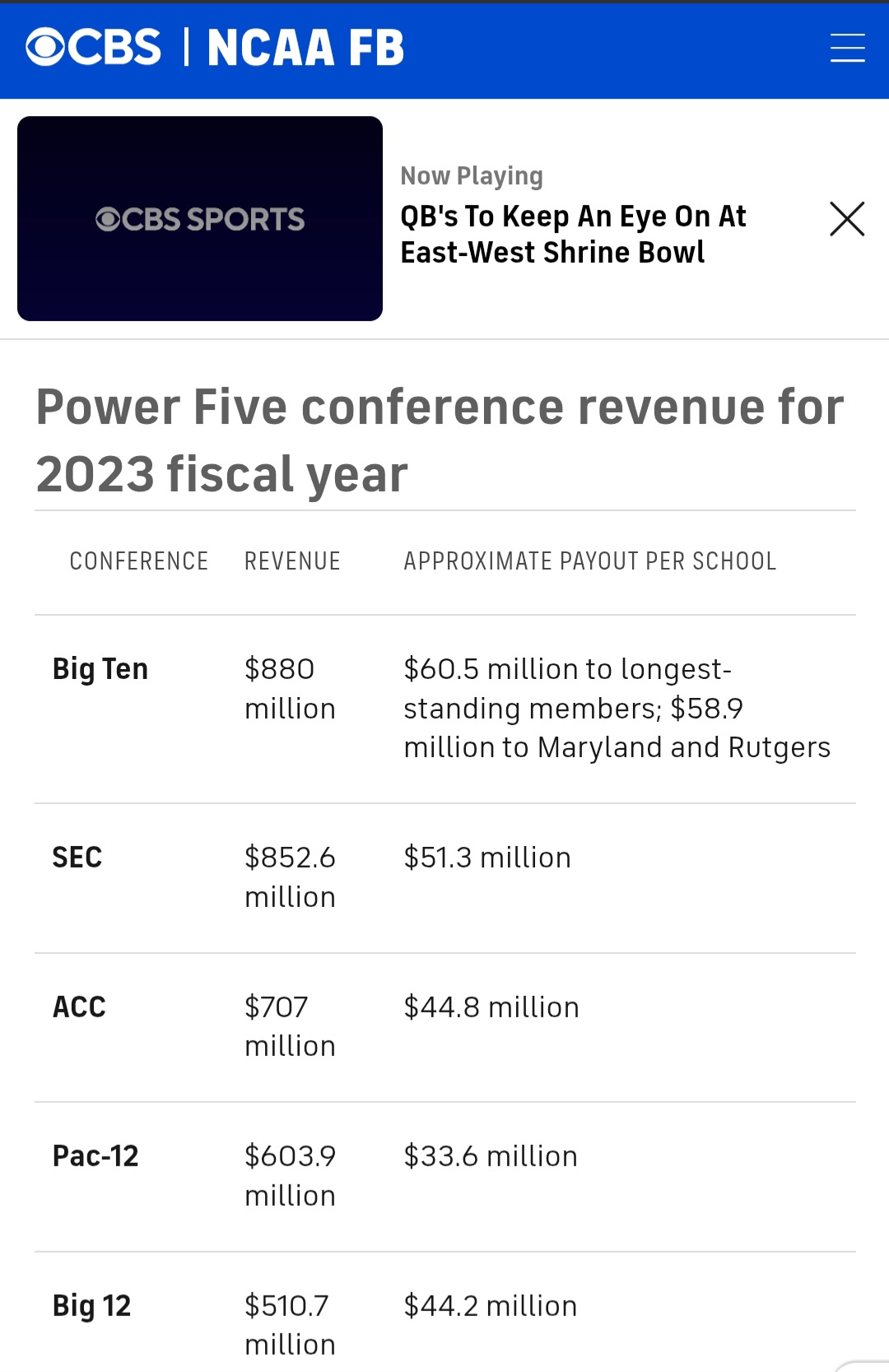 The premise of the original question was why would Norte Dame ever join a conference if they are getting $20M from the CFP. My point was that this year is their best possible scenario--getting to the championship game--and even with that best possible scenario, Notre Dame would still likely to earn more in the Big Ten. If we are using 2023 numbers like is being used in the CBS article than the Norte Dame NBC TV deal is only worth $20-25M per year vs the $60M for the Big Ten.