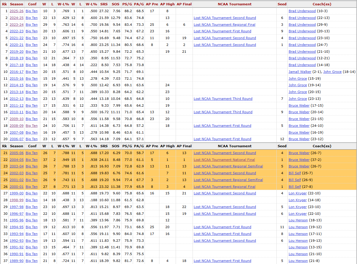 ... The one issue I have with BU is his age. I am not sure how long he will have the desire to coach as hard as he is, and I don't want to see him stay beyond the point where he has the energy to do the job (probably a good reason to keep Tyler). If he makes the tourney this and the next 2 years, he can brag on the longest period of uninterrupted success in Illini history. Think there is a decent chance of that happening.