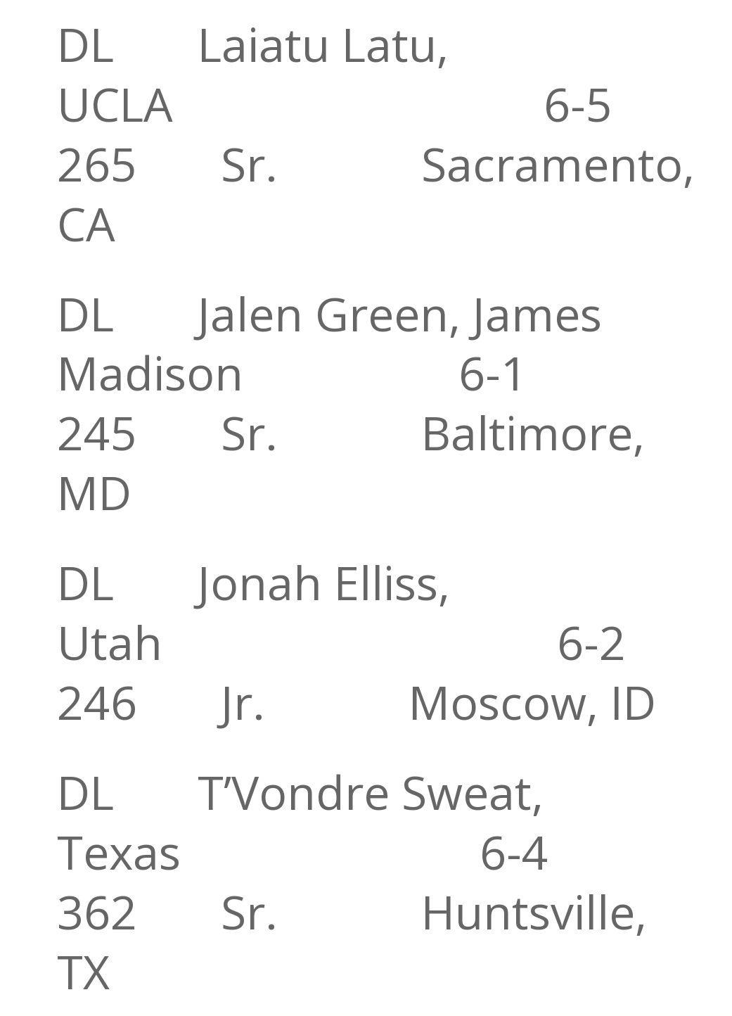 As for leaning on stats, quality of opponent seems to have been a non-factor. One of these players is from James Madison. JMU has three players among the top six national leaders of tackle-for-loss. Among linemen, that's three of the top FOUR.