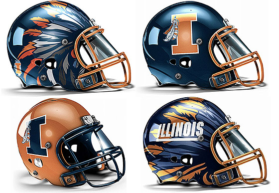 I like all but the one with the Illinois script but this will never happen. I don't think Kingfishers have feathers.Just looked up cool helmet designs, in general. Not Illinois specific. But right near the top was