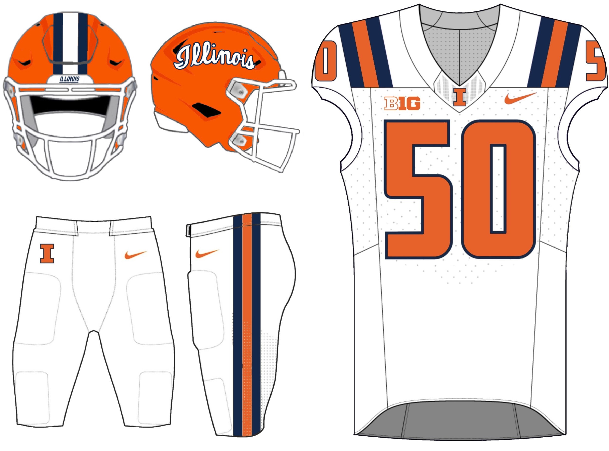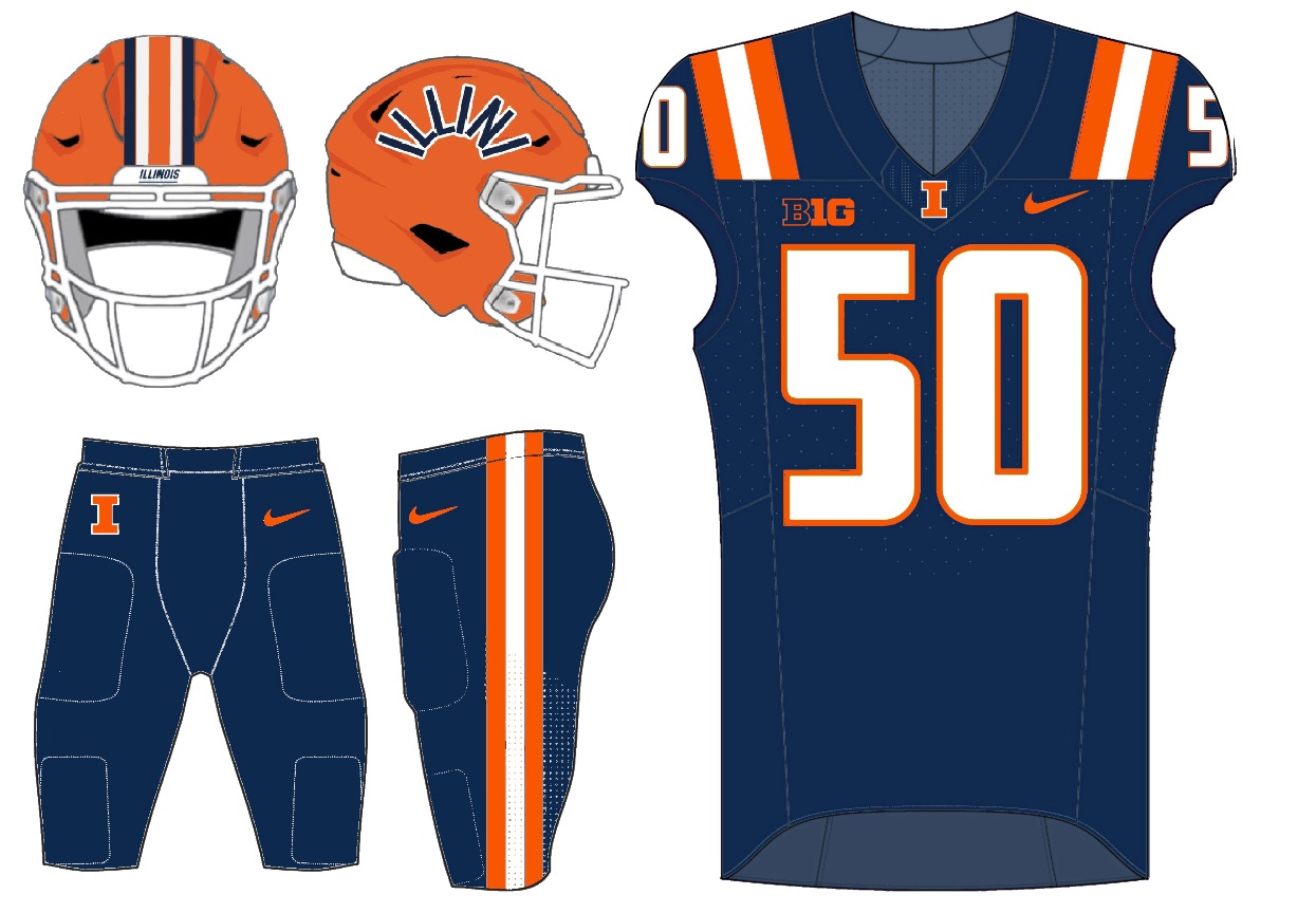 Given that Slant ILLINOIS appears to be here to stay and that we have worn navy pants at home at least once each of the past two seasons, I would say there are decent odds we get to see that first combo for either the Rutgers or Maryland home games (and if it is Maryland, it would be the Slant ILLINOIS Veterans Day version). Given that the OSU game is an "Orange Out," I am sure we will wear our all-orange uniforms, almost certainly with Slant ILLINOIS but I guess Script could be a wild card. I would be very surprised if the Northwestern Senior Day home game isn't just a standard O/B/O, which we have now seen with every helmet.