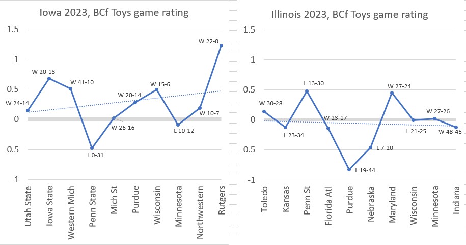 - Illinois has improved over the last four games, but those efforts are below the level of all but two or three of Iowa's performances.