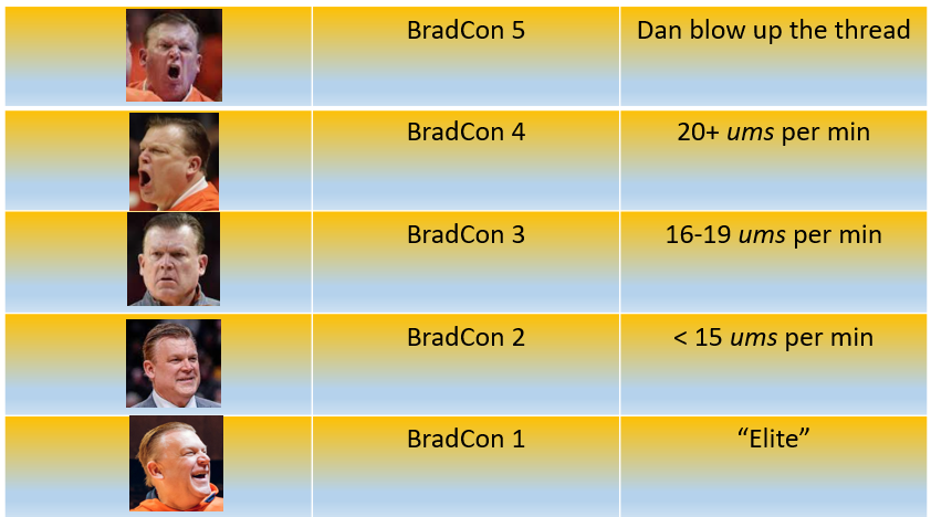 I can tell the win against wisky has calmed BU down by his lowering of the " UM " rate back to that 16-17 per minute level.......One " UM " every 3.5 seconds is a good rate for BU , as anything around the 20 " UM's " per minute show's an elevated risk of a slippage of the tongue and ensuing higher decibel response's............also , he tends to ramble 3-4 " UM's" together which means he is buying time to make his next point of view which usually means about 8-10 seconds of unemcumbered non " UM's " being brought forth.......