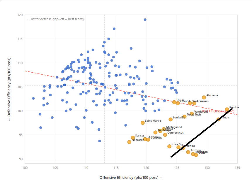 On AdjO and AdjD plots, better is down and to the right. If you want to see who is best according to net efficiency (Off minus Def), you'd draw a diagonal line with a slope of 1: