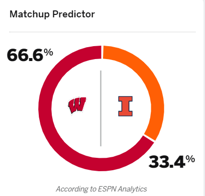 Sportsline has something similar (I will refrain from disclosing any commentary, as it is paid content). They have Wisconsin winning in 63% of the simulations, which is greater than implied odds of 57.1% from the ML. They also have simulations covering the spread 59% of time (at -2.5) compared to implied odds of 52.6%. As a result, they are stating that the best bets are taking Wisconsin ML and more so ATS. However, as you indicate, I take these models with a lot of pause, especially since Wisconsin will have their backup QB starting (granted that has spelled doom for Illini in past). I will say, ESPN is the last place I look for anything chalk related. They have such a bad track record.Seems like the ESPN matchup predictor is a bit lopsided, given the 2.5 point spread on the game. Of course, if I recall correctly, the matchup predictor showed the Illini at over 50% win probabilty for the Purdue game.