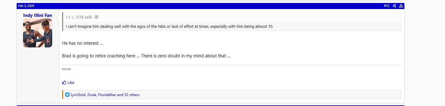 Let me ask you, what have you seen over the past month - the most important part of the season - that leads you to think we are destined for a sustained run in the toughest tournament of the season filled with close games, tough individual players that are hard to guard; along with the fact that we have not had real success in it in the past 20 years minus one season with one of the best pure athletes ever to wear an Illini uniform? How long, in this environment of college sports with the amount of money being invested, do you stick with something that is continually contributing to the ongoing frustration of a fanbase that has been one of the most loyal, supporting fanbases in all of the sport when you regularly have the tallest, one of the most talented rosters, etc, etc in all of basketball? How long are you willing to accept the continual dismissal by most of those who follow the sport when discussing the best of the best?